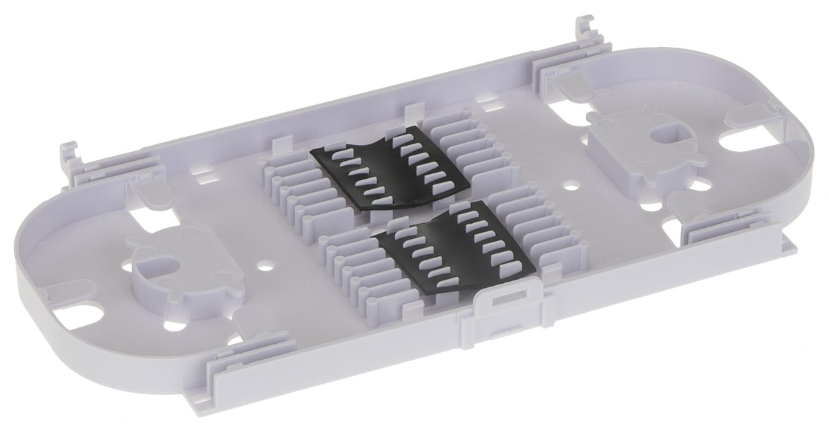ST24M1 je kutija za spajanje vlakana bele boje sa providnim poklopcem i četiri kruta češlja za do 24 zavara.
